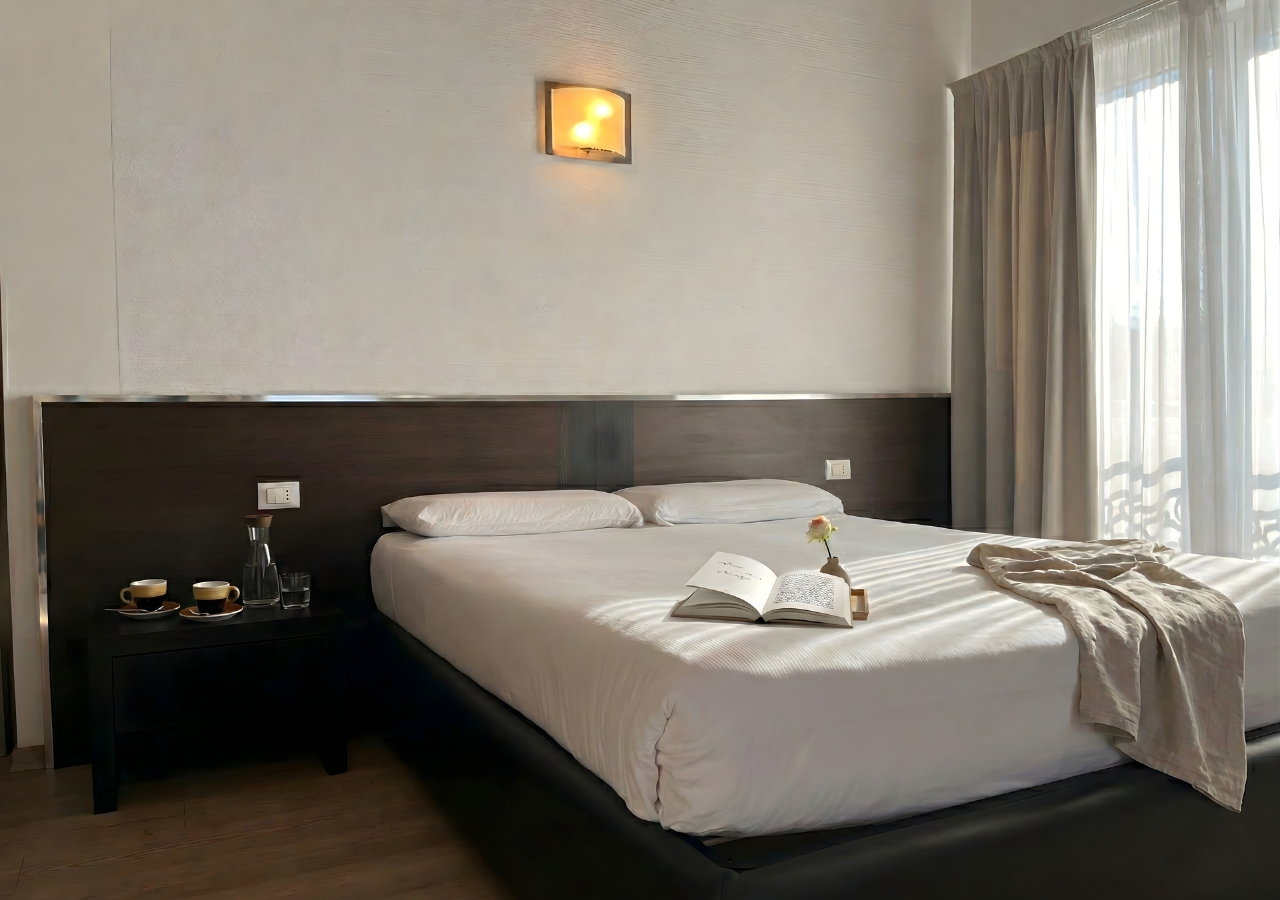 Una camera luminosa e accogliente con affaccio frontale sul Lago di Garda. Il terrazzino privato offre una delle viste più aperte e suggestive della nostra struttura, ideale per chi desidera vivere appieno la tranquillità del lago fin dal mattino.